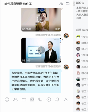 张老师的课在下午5-6节,她所带的课程是公司软件工程专业1701-1702班的《软件项目管理》课程。中午得到了一些上午上课老师的反馈,各个平台不算稳定,网络卡顿是大问题,微信慕课堂签到系统崩溃,腾讯课堂直播靠谱,于是中午她又一次把下午课程的流程再过一遍。还好前期准备比较充分,针对各种突发情况做了很多个版本的预案,所以很快缕清了思路,给员工发送了“《软件项目管理》线上课堂五步走方针”,提前让员工有个思想准备,内容如下: