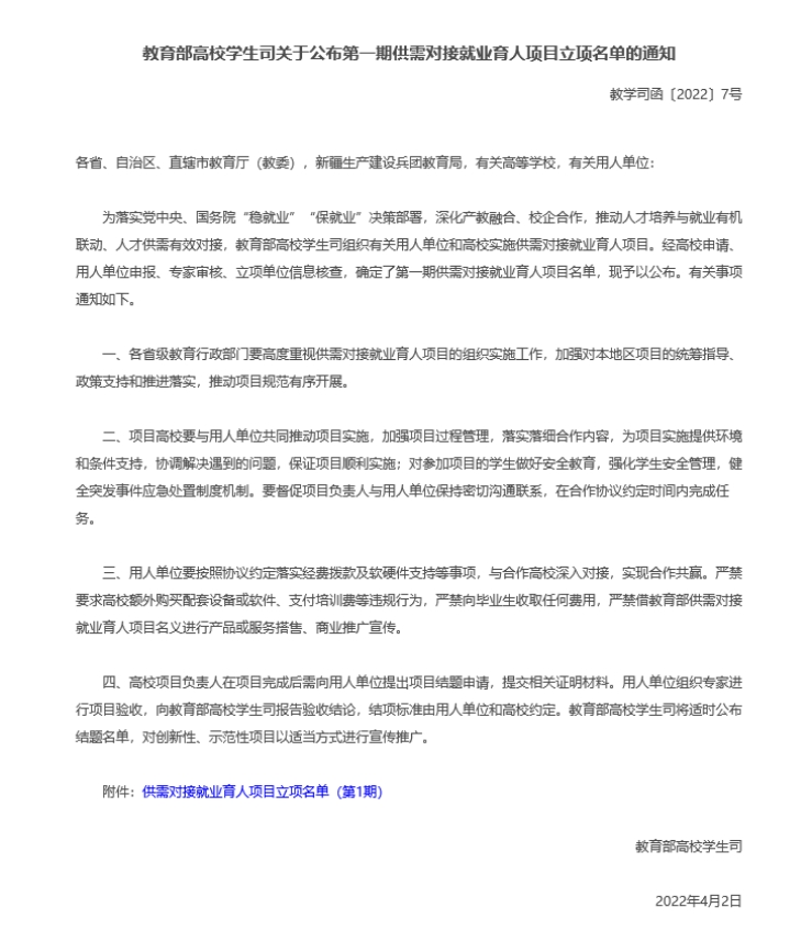 本项目是教育部为落实党中央、国务院“稳就业”“保就业”决策部署,深化产教融合、校企合作,推动人才培养与就业有机联动、人才供需有效对接,教育部高校员工司组织有关用人单位和高校实施供需对接就业育人项目。经高校申请、用人单位申报、专家审核、立项单位信息核查,确定了第一期供需对接就业育人项目名单。